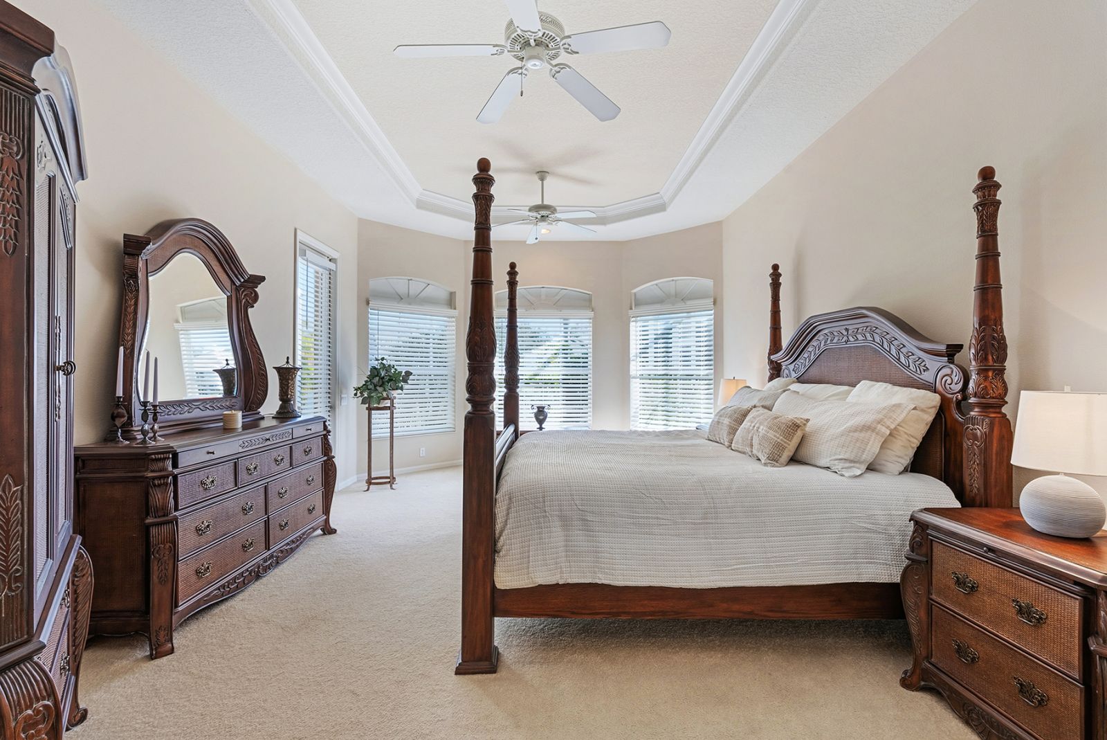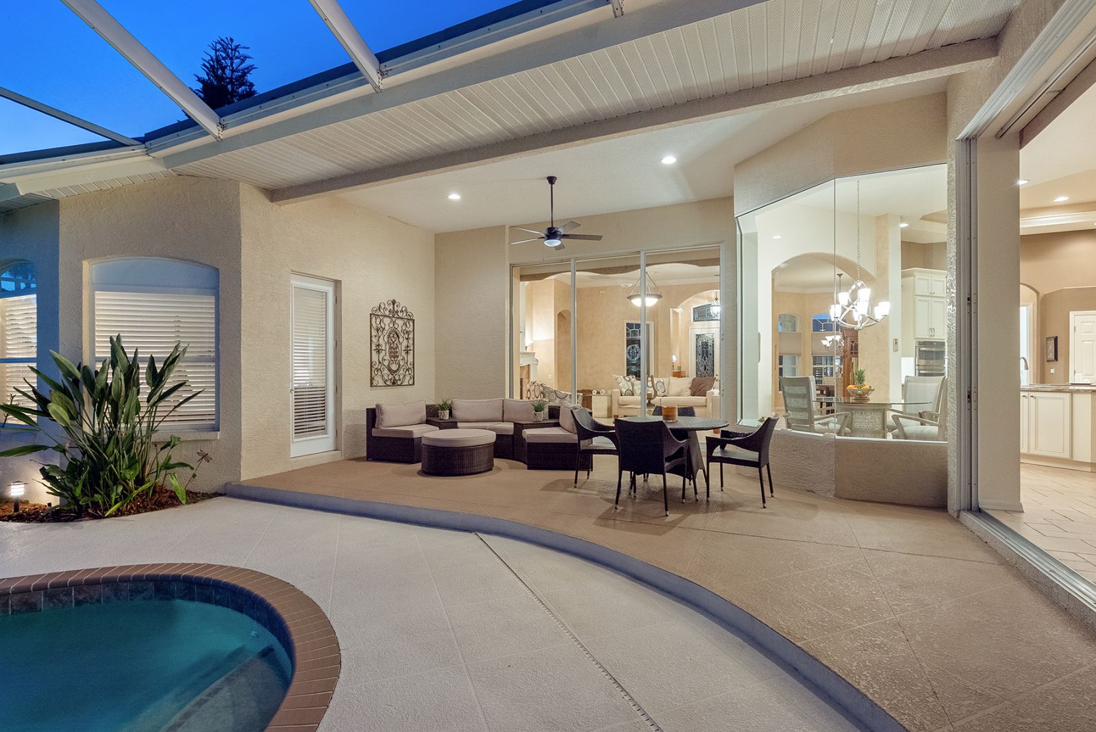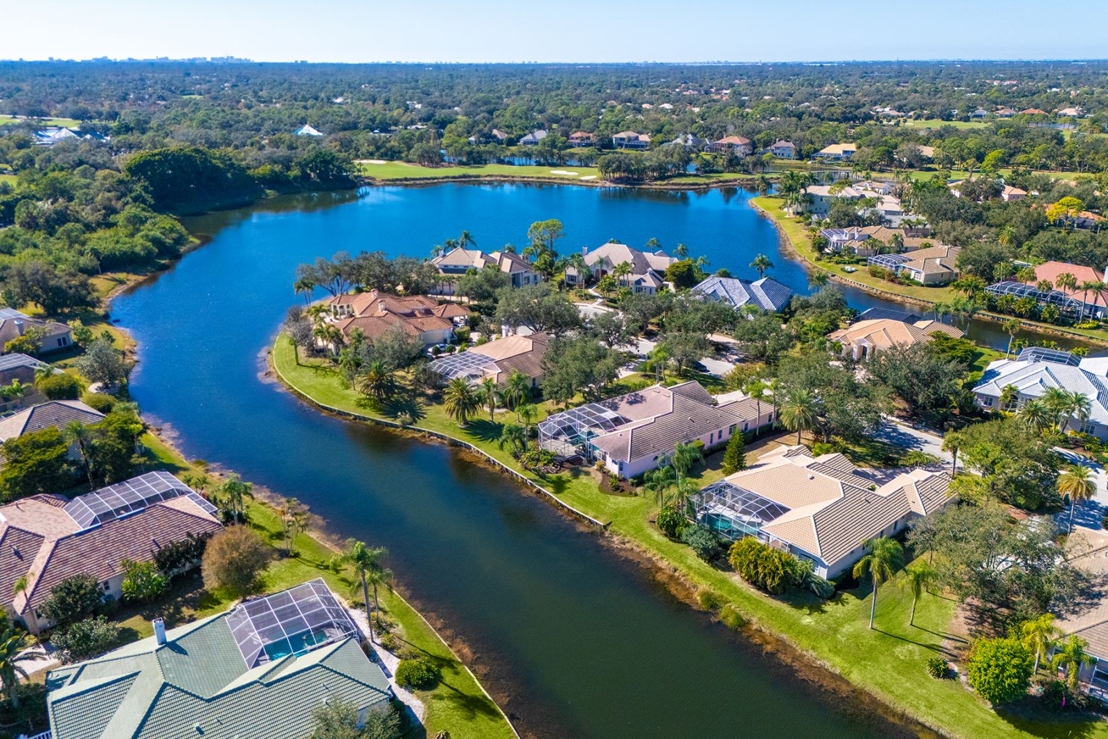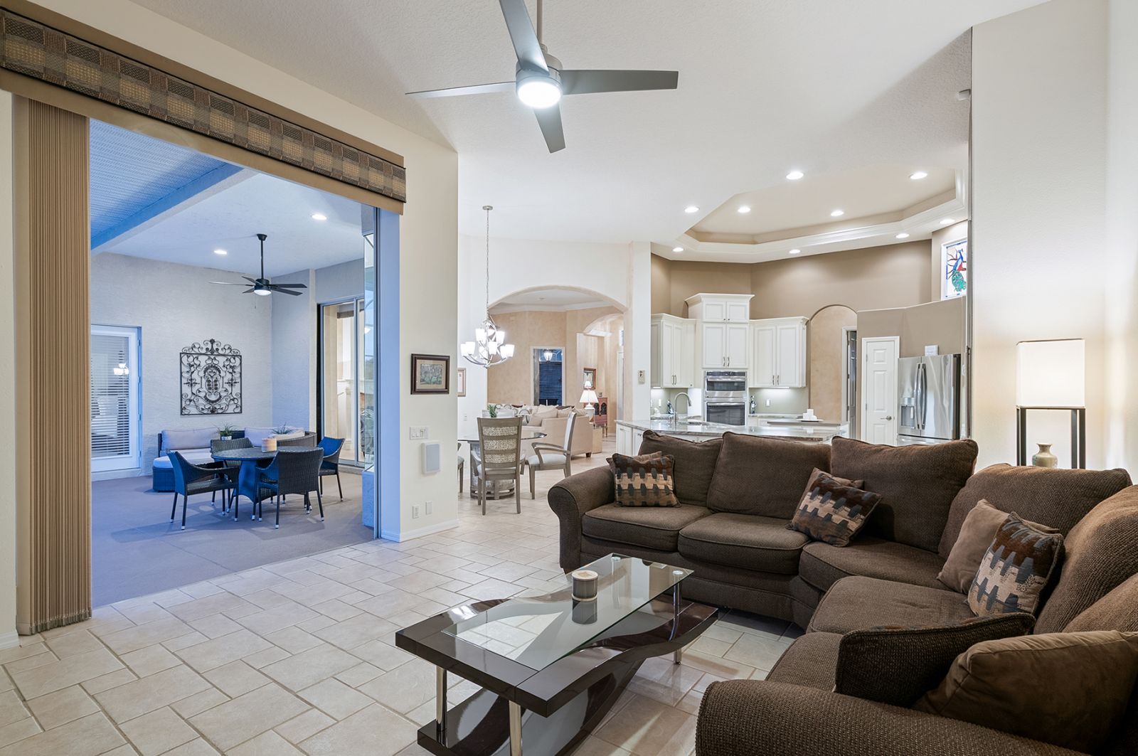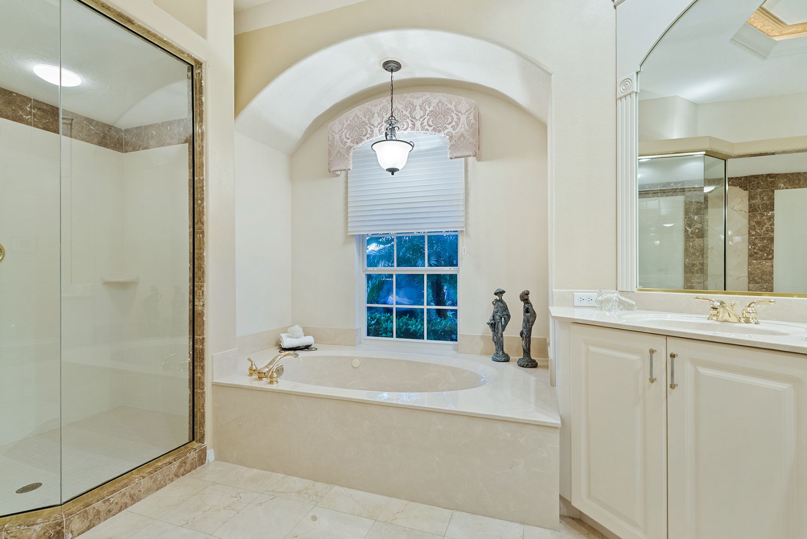 Welcome to this beautifully appointed Neal Custom Homes residence offering serene water views, exceptional architectural detail, and resort-style outdoor living. This 3-bedroom, 3-bath home with an oversized 3-car garage offers 3356 sf and is thoughtfully designed for both everyday comfort and elegant entertaining.A double designer leaded-glass front door opens to a striking foyer with marble inlay flooring, setting the tone for the refined interiors. High-end ceramic tile laid on the diagonal flows throughout the main living areas, complemented by tray and coffered ceiling details, crown molding, custom niches, and recessed lighting. The living room features a triple tray ceiling, an electric fireplace, and pocket sliders that open seamlessly to the lanai.The brand-new kitchen (2021) is the heart of the home, showcasing rich off-white wood cabinetry, exotic granite countertops, a quartz-topped center island, GE stainless steel appliances, subway tile backsplash, under-cabinet lighting, a spacious pantry, built-in oven with microwave, and an aquarium window in the breakfast area. Open to the family room and lanai, this space is ideal for entertaining.The primary suite is a private retreat featuring a sitting area with bay-style windows, coffered ceiling, dual customized closets, double-door entry, and private access to the lanai. The spa-inspired, wheelchair-accessible primary bath offers an oversized marble-detailed shower, Jacuzzi tub, marble flooring, expansive double vanity with makeup area, cultured marble countertops, triple mirrors, and new designer hardware.Bedroom two is a generously sized custom suite with a large closet and bath featuring a cultured marble vanity and tub/shower combination. Bedroom three is adjacent to a full hall bath with enclosed shower, linen closet, and updated brushed-silver fixtures. A large rear den with cathedral-style ceiling and sliders to the lanai can easily serve as a fourth bedroom with the addition of a closet.Step outside to your private oasis with a kidney-shaped heated pool and spa, lush updated landscaping with lighting, and a covered lanai offering space for a future outdoor kitchen (currently equipped with refrigerator and cabinetry).The oversized 3-car garage features higher ceilings, a painted floor, storage cabinetry, exterior access, and an electric hydraulic car lift, perfect for car enthusiasts. Additional highlights include central vacuum, exquisite lighting, select new fans, window treatments, brushed-silver hardware throughout, and a well-appointed laundry room with cabinetry, sink, and built-in ironing board.Available furnishings may be purchased separately.