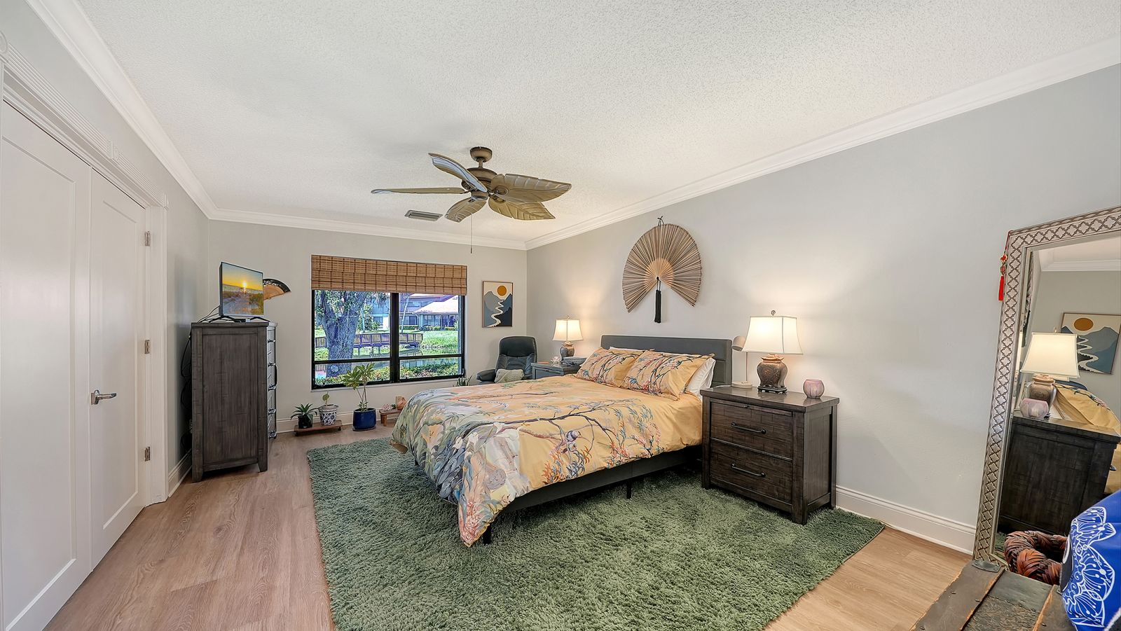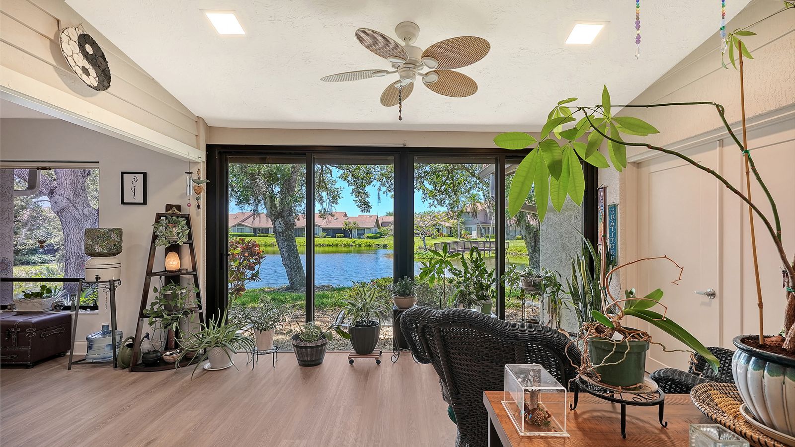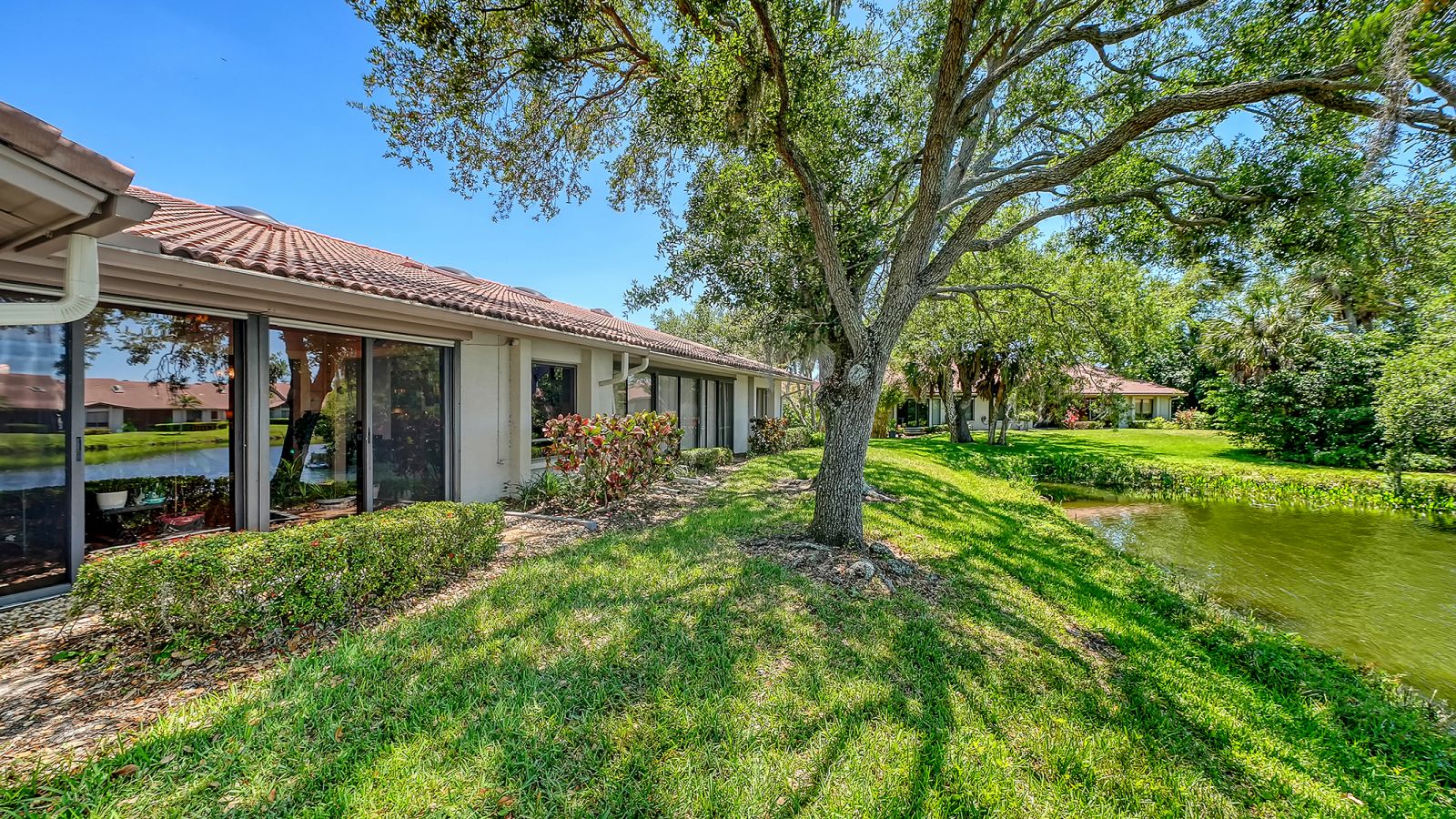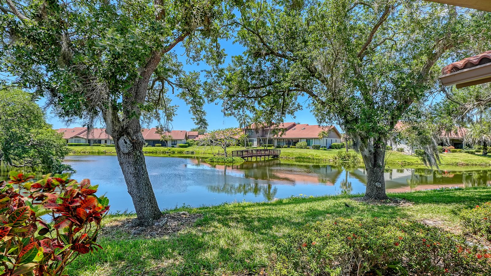 MOVE-IN READY and maintenance-free, this beautifully updated lakefront villa offers the perfect blend of modern comfort and serene Florida living in the highly desirable 55+ community of Lakeshore Village! Featuring 2 bedrooms plus a spacious den, 2 baths, and 2,024 sq. ft., this meticulously maintained home showcases wide plank luxury vinyl flooring, soaring vaulted ceilings, and stunning water views throughout. The beautifully updated kitchen is a chef?s delight with granite countertops, upgraded cabinetry, stainless steel appliances, and a dry bar with additional storage in the breakfast area?perfect for casual dining or entertaining. The spacious living room flows seamlessly into the enclosed lanai, creating additional living space and showcasing breathtaking lake views and peaceful wildlife right outside your door. Electronic hurricane shutters at the sliding doors provide added peace of mind. The private primary suite features crown molding, lake views, a large walk-in closet, and a beautifully updated ensuite bath with dual quartz-topped vanities and a large tiled walk-in shower. On the opposite side of the home, the guest bedroom sits adjacent to a fully updated bath, while the oversized den with pocket doors offers the flexibility of a home office, hobby room, or potential third bedroom. Additional highlights include a large laundry room, a spacious 2-car garage with extra storage and hurricane-rated garage door, new A/C and ductwork (2021), advanced air sterilization system (2024), whole-home re-pipe (2023), upgraded electrical panel with surge protector, and newer dishwasher (2021). Lakeshore Village offers resort-style amenities including a heated saltwater pool, clubhouse, tennis, pickleball, billiards, library, fishing lakes, and an active social calendar. Conveniently located near shopping, dining, golf, medical facilities, and just minutes to world-famous Siesta Key Beach?this is Florida living at its finest!