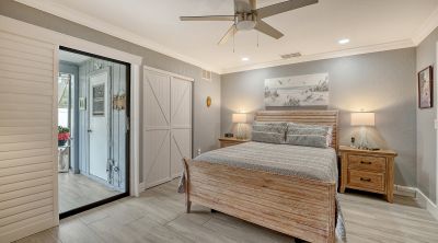 Beautifully re-modeled 3 years ago 2 BR/2BA with single garage villa/condo with two years new roof located in the wonderful community of Village Oaks. This lovely locale offers lots of mature oak trees and greenspace, a beautiful lakeside heated pool, tennis and pickleball courts. These beautiful grounds are maintained by the HOA and includes a dock on the pond by the heated community pool. This home features beautiful light gray wide plank tile flooring, crown molding throughout, plantation shutters, three fans throughout home, new garage door and lots of beautiful cabinetry. The kitchen features a granite island with the waterfall motif on each side of the island and has a stainless steel sink. All newer LG stainless steel appliances in kitchen. Bar stools can remain with home. Primary bedroom has large walk-in closet and another closet with barn door entry for more storage space. En-suite primary bedroom affords you your own private re-modeled bathroom with tiled shower walls and pebble look tile flooring. Corian solid surface bathroom counter. Second bedroom has the bathroom conveniently located by the bedroom entrance. Second bathroom features a beautifully tiled bathtub/shower with solid surface granite countertop. Laundry room features GE washer and dryer and shelving for storage. Beautiful tiled screened lanai off of great room and primary bedroom. Great room features custom built-in electric fireplace with gorgeous cabinetry for lots of storage. Kitchen opens up to great room affording you a gorgeous open floor plan. Screened-in front porch with seating area. Village Oaks is close to downtown and minutes away from UTC Mall and the world class rowing lake. It is located in the preferred "X" flood zone. Downtown Sarasota is close by and known for its unique restaurants and theaters. World class beaches are nearby along with golfing and boating. Village Oaks is pet friendly allowing one small dog or cat up to 35 lbs. Come enjoy this picturesque community.