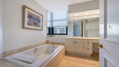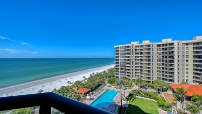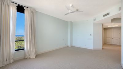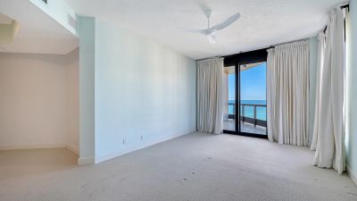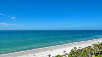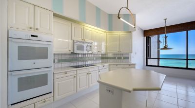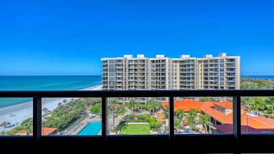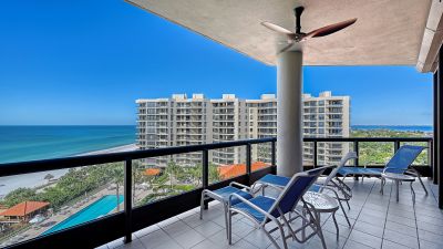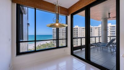 Welcome to The Water Club at Longboat Key, where privacy, spaciousness, and resort-style amenities complement the natural beauty of the setting at the edge of the sparkling waters of the Gulf of Mexico. Residents benefit from a semi-private elevator that opens directly into an impressive foyer, offering sweeping views of Sarasota Bay and the city skyline through floor-to-ceiling windows. This residence is on the north side of the south building, the sunset view side, overlooking the beautiful pool deck amenity of the community. This eighth-floor Brighton residence is highly coveted for its three-bedroom configuration with panoramic vistas of the Gulf, beach, and bay from two expansive terraces. Features include ten-foot ceilings, extensive glass walls, and storm protection shutters , enhancing both comfort and sophistication. The living room is designed to maximize openness and showcase sunsets over the Gulf. The primary suite offers a private terrace, den, walk-in closet, and dual bathrooms. With a split-bedroom plan, privacy is maintained for two generous guest suites, each featuring an en-suite bath. The kitchen is efficiently appointed with significant storage and a breakfast area overlooking the water. The Water Club stands as Longboat Key's premier gated beachfront community, situated on 16 acres of meticulously landscaped grounds. Amenities include a 17,000-square-foot clubhouse, well-equipped fitness center and spa, heated lap pool and hot tub, four Har-Tru tennis courts, concierge services, and versatile gathering spaces such as a library, billiards room, ballroom, firepit, and grilling area. Additional conveniences include under-building parking, climate-controlled storage, on-site management, and 24-hour security. Ideally located on the south end of Longboat Key, residents enjoy proximity to Longboat Key Club golf facilities, Publix shopping center, exclusive St. Armands Circle, downtown Sarasota's cultural offerings, and Sarasota International Airport, just 20 minutes away. The Water Club is pet-friendly and impeccably maintained, providing the pinnacle of coastal luxury living.