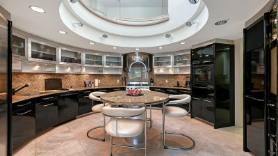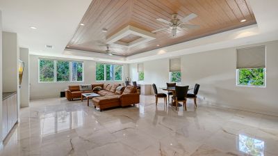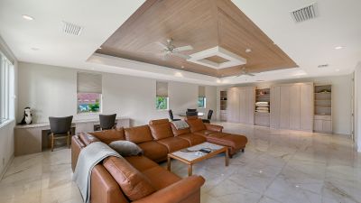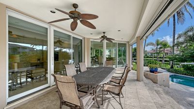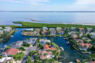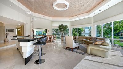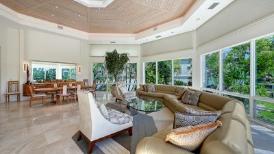 Bay Isles Harbor, Longboat Key - Stunning 4BR/5.5BA, 5,080 SF waterfront home in the prestigious Bay Isles Harbor section of Longboat Key. This architectural masterpiece features a dramatic great room with soaring tongue-and-groove ceilings and floor-to-ceiling windows showcasing sweeping water views. The circular kitchen offers stone counters, top-tier appliances, and integrated Lutron lighting, audio, and video systems. The first-floor primary suite opens to the pool and screened patio with a spa-style bath and private office. A newer 32x23 guest suite includes two Murphy beds, entertainment area, steam shower, and sauna. Enjoy a private dock on protected deep sailboat water with a 12,000 lb. lift. Bay Isles residents enjoy gated security and access to the exclusive Bay Isles Beach Club on the Gulf of Mexico.