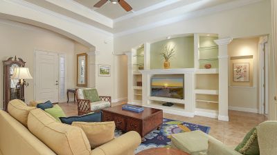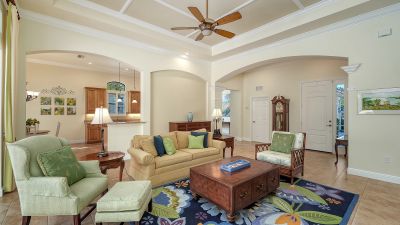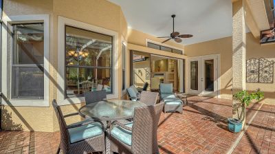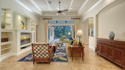 Located in the sought-after maintenance-free Silverwood enclave of the prestigious gated Lakewood Ranch Country Club, this Neal Homes residence combines timeless craftsmanship with refined comfort in a beautifully landscaped setting. A gracious entry reveals tile flooring throughout the main living areas, crown molding, recessed lighting, and a living room enhanced by beam detailing on the tray ceiling, custom built-ins, and gorgeous views of the screened lanai, pool, and spa, and lush landscaping. The kitchen is thoughtfully designed with stainless steel appliances including a five-burner LG gas range, granite countertops, a center island, ample cabinetry, pendant and under-cabinet task lighting, a large pantry, and an inviting eat-in area overlooking the pool. A formal dining room adds elegance with its ceiling medallion and natural flow for entertaining. The expansive primary suite offers a quiet retreat with high-end carpet, 2 spacious walk-in closets, private French-door access to the lanai, and a spa-inspired bath featuring dual vanities, a soaking tub, a walk-in glass-and-tile shower, and a separate water closet. Two generously sized guest bedrooms provide comfort and versatility--one currently serving as a bright office space--with large closets, including one walk-in, and access to a well-appointed guest bath with a bathtub/shower combination and stylish vanity. The home includes a laundry room with newer full-size LG washer, dryer and utility sink, plus an oversized 2-car courtyard-facing garage with plentiful built-in storage and an additional convenient utility sink. White plantation shutters, high-end finishes, a new water heater (2025), 3M protection on all windows, hurricane-rated fabric panel for the front entry and mature landscaping elevate the overall safety and appeal, while the herringbone-pattern brick paver driveway and meticulously maintained grounds create an inviting arrival. Silverwood is known for its winding streets, majestic trees, and wide sidewalks, all within the guard-gated Lakewood Ranch Country Club, where optional membership in the Club provides access to 4 championship golf courses, a state-of-the-art fitness center, tennis and pickleball courts, resort-style pools, multiple clubhouse dining options, and miles of scenic trails. Lakewood Ranch, America's #1 rated master-planned community, is nationally recognized for its exceptional lifestyle, offering beautifully maintained neighborhoods, scenic trails and parks, top-rated schools, and vibrant town centers filled with dining, shopping, and year-round events...all just minutes from premier beaches, medical centers, and Sarasota's cultural attractions.
