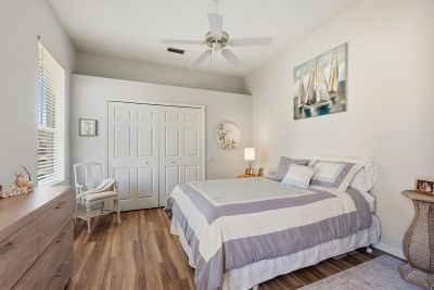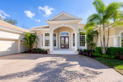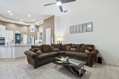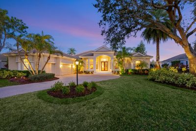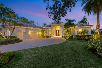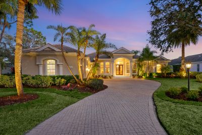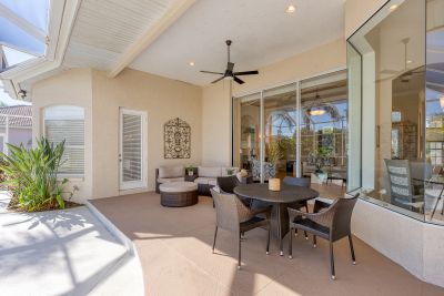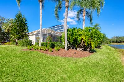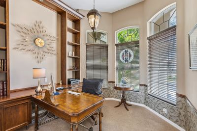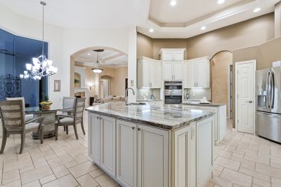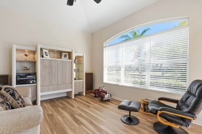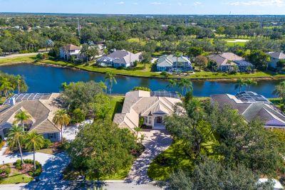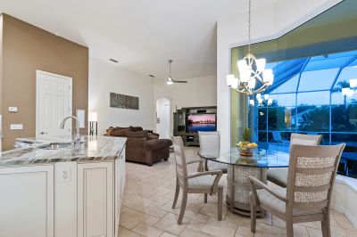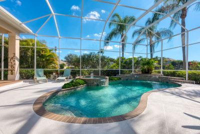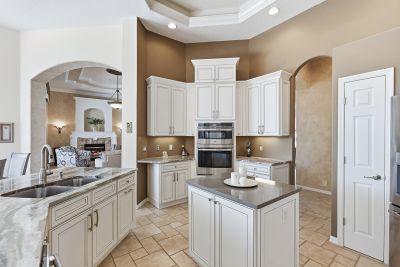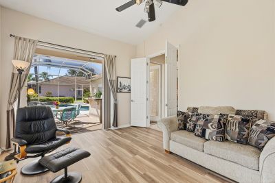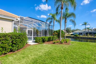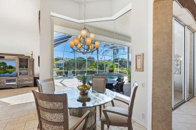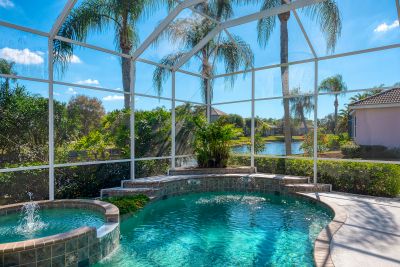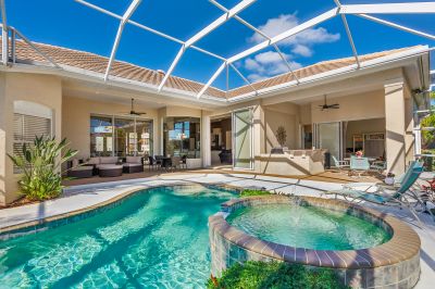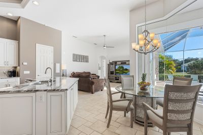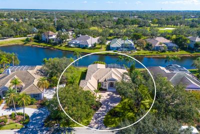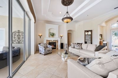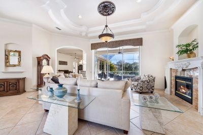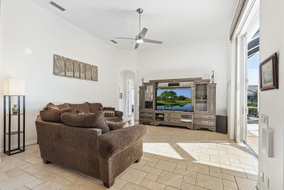 Welcome to this beautifully appointed Neal Custom Homes residence offering serene water views, exceptional architectural detail, and resort-style outdoor living. This 3-bedroom, 3-bath home with an oversized 3-car garage offers 3356 sf and is thoughtfully designed for both everyday comfort and elegant entertaining.A double designer leaded-glass front door opens to a striking foyer with marble inlay flooring, setting the tone for the refined interiors. High-end ceramic tile laid on the diagonal flows throughout the main living areas, complemented by tray and coffered ceiling details, crown molding, custom niches, and recessed lighting. The living room features a triple tray ceiling, an electric fireplace, and pocket sliders that open seamlessly to the lanai.The brand-new kitchen (2021) is the heart of the home, showcasing rich off-white wood cabinetry, exotic granite countertops, a quartz-topped center island, GE stainless steel appliances, subway tile backsplash, under-cabinet lighting, a spacious pantry, built-in oven with microwave, and an aquarium window in the breakfast area. Open to the family room and lanai, this space is ideal for entertaining.The primary suite is a private retreat featuring a sitting area with bay-style windows, coffered ceiling, dual customized closets, double-door entry, and private access to the lanai. The spa-inspired, wheelchair-accessible primary bath offers an oversized marble-detailed shower, Jacuzzi tub, marble flooring, expansive double vanity with makeup area, cultured marble countertops, triple mirrors, and new designer hardware.Bedroom two is a generously sized custom suite with a large closet and bath featuring a cultured marble vanity and tub/shower combination. Bedroom three is adjacent to a full hall bath with enclosed shower, linen closet, and updated brushed-silver fixtures. A large rear den with cathedral-style ceiling and sliders to the lanai can easily serve as a fourth bedroom with the addition of a closet.Step outside to your private oasis with a kidney-shaped heated pool and spa, lush updated landscaping with lighting, and a covered lanai offering space for a future outdoor kitchen (currently equipped with refrigerator and cabinetry).The oversized 3-car garage features higher ceilings, a painted floor, storage cabinetry, exterior access, and an electric hydraulic car lift, perfect for car enthusiasts. Additional highlights include central vacuum, exquisite lighting, select new fans, window treatments, brushed-silver hardware throughout, and a well-appointed laundry room with cabinetry, sink, and built-in ironing board.Available furnishings may be purchased separately.