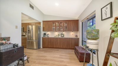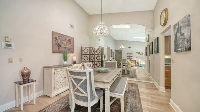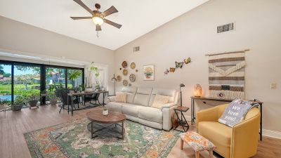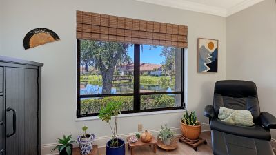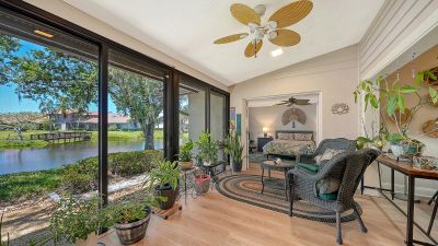 MOVE-IN READY and maintenance-free, this beautifully updated lakefront villa offers the perfect blend of modern comfort and serene Florida living in the highly desirable 55+ community of Lakeshore Village! Featuring 2 bedrooms plus a spacious den, 2 baths, and 2,024 sq. ft., this meticulously maintained home showcases wide plank luxury vinyl flooring, soaring vaulted ceilings, and stunning water views throughout. The beautifully updated kitchen is a chef?s delight with granite countertops, upgraded cabinetry, stainless steel appliances, and a dry bar with additional storage in the breakfast area?perfect for casual dining or entertaining. The spacious living room flows seamlessly into the enclosed lanai, creating additional living space and showcasing breathtaking lake views and peaceful wildlife right outside your door. Electronic hurricane shutters at the sliding doors provide added peace of mind. The private primary suite features crown molding, lake views, a large walk-in closet, and a beautifully updated ensuite bath with dual quartz-topped vanities and a large tiled walk-in shower. On the opposite side of the home, the guest bedroom sits adjacent to a fully updated bath, while the oversized den with pocket doors offers the flexibility of a home office, hobby room, or potential third bedroom. Additional highlights include a large laundry room, a spacious 2-car garage with extra storage and hurricane-rated garage door, new A/C and ductwork (2021), advanced air sterilization system (2024), whole-home re-pipe (2023), upgraded electrical panel with surge protector, and newer dishwasher (2021). Lakeshore Village offers resort-style amenities including a heated saltwater pool, clubhouse, tennis, pickleball, billiards, library, fishing lakes, and an active social calendar. Conveniently located near shopping, dining, golf, medical facilities, and just minutes to world-famous Siesta Key Beach?this is Florida living at its finest!