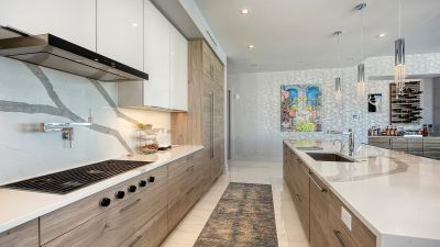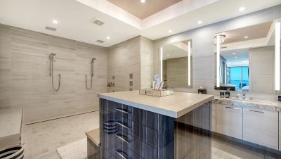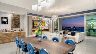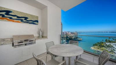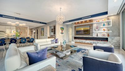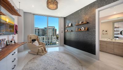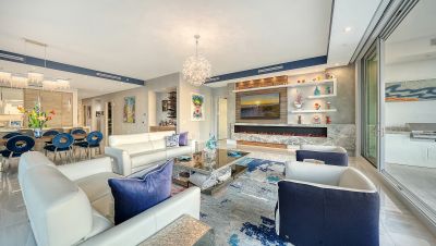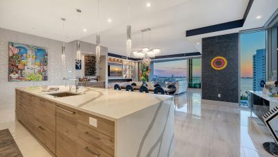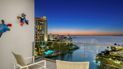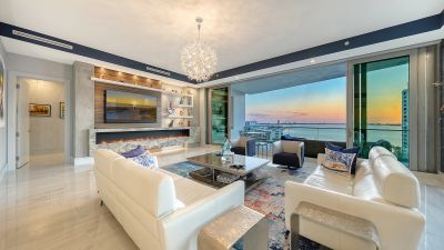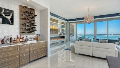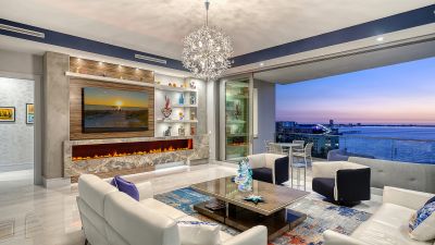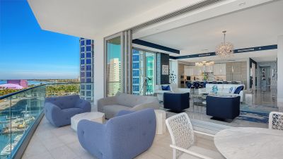 One-of-a-kind and completely custom, Residence #805 at The Ritz-Carlton Residences in downtown Sarasota is a rare offering in a premier waterfront location. Perched on the eighth floor, this highly customized corner residence is uniquely positioned with direct bridge access to The Ritz-Carlton Hotel--placing world-class amenities, valet services, and fine dining at Rufa, Jack Dusty, and Ocean Prime just seconds from your private entry. Offered furnished and professionally designed, this exceptional corner residence showcases panoramic views of Sarasota Bay, the John Ringling Bridge, the city skyline, and vistas that stretch toward the Gulf of Mexico. With more than 3,600 square feet of interior living space, this three-bedroom plus den condominium delivers refined waterfront living within a Ritz-Carlton managed property. A private residents-only elevator opens directly into the foyer, where illuminated built-in art displays and natural wood accents create a gallery-style arrival. The great-room layout is framed by 11-foot ceilings throughout and walls of floor-to-ceiling glass, maximizing water and skyline views from nearly every vantage point. Porcelain tile flooring extends throughout, reinforcing the seamless flow of the open design. The living area is anchored by a dramatic water vapor fireplace and a custom-designed bar with dual beverage refrigerators and an art-inspired wine storage wall. Expansive sliders open to the main terrace, where a summer kitchen and glass railings preserve uninterrupted bay views. The chef's kitchen blends architectural precision with performance, appointed with Wolf professional-grade appliances concealed behind sleek cabinetry, a five-burner gas cooktop with pot filler, dual built-in ovens with warming drawer, custom quartzite countertops, tile backsplash, and an oversized waterfall-edge island with dine-in seating. A walk-in pantry enhances functionality and organization. The northwest-facing primary suite serves as a private sanctuary, complete with its own bayfront terrace, custom inset lighting, built-in workstation, floating shelves, and a dry bar with beverage refrigerator. Dual walk-in closets feature motion lighting and glass display cabinetry. The spa-inspired bath includes dual vanities, a central island with bench seating, a stone shower with multiple showerheads and built-in bench, and a private water closet. Two guest suites are arranged in a split layout for added privacy, each with en-suite baths and custom built-ins. The den, framed by floor-to-ceiling glass and integrated shelving, functions beautifully as a home office or media lounge. Additional features include Crestron smart home system controlling the lighting, shades, audio, and video; Nest thermostat; three private terraces with glass railings; one of only ten oversized private one-car garages, featuring built-in storage and two full-size wine coolers accommodating 166 bottles each; and an additional oversized parking space directly across from the private garage. As part of a Ritz-Carlton managed property, residents enjoy an unmatched level of service and amenities, including a 70-foot heated lap pool, resort-style pool and spa with cabanas, poolside bar, club and social rooms, news and sports cafe, fitness center with yoga studio, boardroom, multi-purpose room, dog park with pet washing station, 24-hour concierge, valet service, and on-site management. In-residence dining, housekeeping, and laundry services are also available.