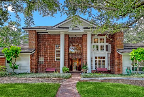 Southern elegance surrounds you in this gracious traditional 2-story home situated on a beautifully landscaped corner lot. The property boasts grand oak trees and lush tropical foliage, creating a serene and visually appealing outdoor environment.The light-filled great room features soaring ceilings, French doors, and a wood-burning fireplace, offering a warm and inviting space for relaxation and entertaining. The spacious covered lanai overlooks the private, heated in-ground pool and spa with an automatic pool sweep, providing the perfect setting for al fresco dining and leisure.The cook's kitchen is equipped with stainless steel appliances, a huge granite breakfast bar for casual meals and entertaining, a kitchen center island, and a built-in desk area, catering to the needs of the modern household. The formal dining room, with its charming bay window overlooking the front gardens, provides the perfect setting for more formal occasions.The primary bedroom, located on the first floor, is a spacious retreat with an en-suite bathroom and a walk-in closet. Two additional bedrooms and a bathroom are situated on the second floor, accessed by an overlook walkway with great views both inside and out.Throughout the home, rich hardwood and oversized porcelain tile floors contribute to the elegant, timeless aesthetic. The property also features an EV home-charging station, hurricane-rated windows, Kevlar Astro-Flex hurricane panels, a new AC system and air ducts (2020), a new pool heater (2023), and a new water heater (2023), ensuring the home is equipped with modern amenities and energy-efficient features.Situated in a private community of only 45 homes, this residence is conveniently located just 5 minutes from the UTC Mall area and 15 minutes from downtown Sarasota and the beaches, allowing for easy access to a variety of shopping, dining, and recreational opportunities.