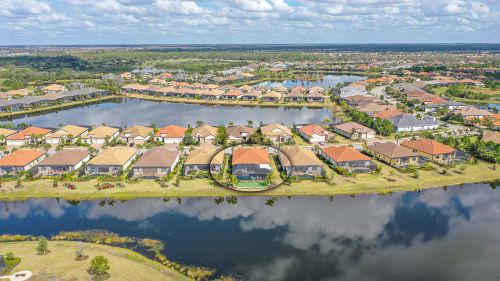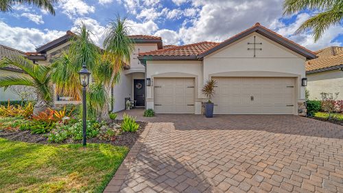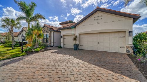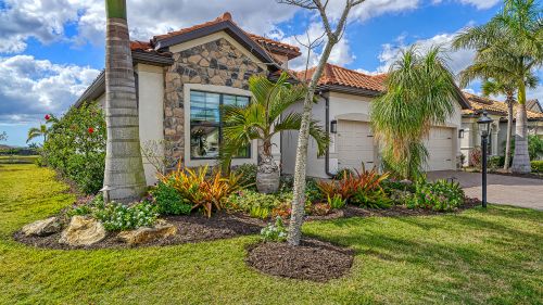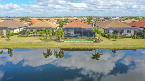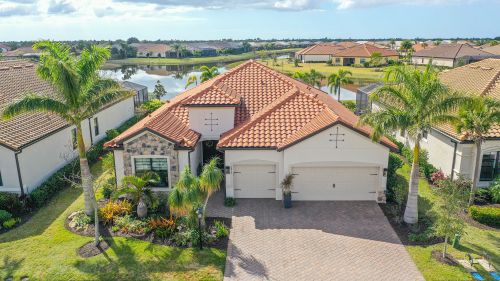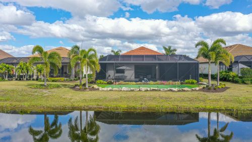 Welcome to lake-front living at its finest! This stunning Sommerville floorplan, built in 2019, is situated in one of the most desirable lots and neighborhoods in Lakewood Ranch, Country Club East. Boasting many exquisite upgrades, this home will provide you with all the luxury amenities you desire. Step outside and enjoy your generously oversized custom lanai with travertine decking. Two covered seating areas for entertaining and a motorized sunshade to keep you nice and cool in the summer months and warm in the winter. Including firepit, ceiling fans, outdoor kitchen featuring a state-of-the-art smokeless grill, refrigerator, and plenty of storage space - this home is an entertainer's dream! Relax by your over-sized custom saltwater pool with a glass yacht club blue bottom or soak away your cares in the heated spa after an afternoon spent on your personal putting green. Inside you'll find 3 beds/3 baths, office, and a three-car garage with an air conditioner and wall-mounted mirrors. Enjoy this beautiful open floor plan that features a large kitchen, new frosted door for walk-in pantry, new custom oversize rare quartz island and custom millwork for added elegance. This is the perfect home for gatherings with an electric fireplace to cozy up next to on cooler nights. This home offers hurricane proof windows and sliding glass doors. The owner's suite has newly installed Tesoro tile floors. With so many extraordinary features this home is a true gem. There are no homes in CCE that offer this magnitude of outdoor living. This home is being sold fully furnished (wall art & dcor not included) Experience true luxurious lakefront living today - schedule your showing now!