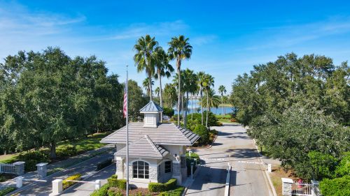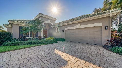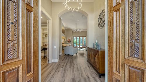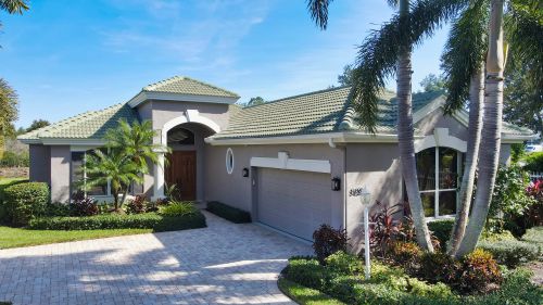 Stunning Custom Arthur Ruttenberg Home in private gated community with low HOA Fees. The carved wood double doors at the entry lead you to a beautifully updated, custom decorated home with Two Bedrooms, 2 1/2 Baths with upgraded fixtures (including Toto toilets) and an open floor plan featuring a stunning kitchen with quartz countertops, and custom wood cabinets, a marble backsplash, and a center island. The Dining Room is currently furnished as a den. The office was originally the third bedroom and can easily be reconverted back. Open floor plan with luxury wood-look vinyl floors, baseboards. crown moldings, trey ceilings, chair rail molding in the office and dining room, architecturally designed wood paneled walls in bedrooms, crystal doorknobs, and stunning chandeliers. The home also has a central vacuum system. Beautiful wood French doors lead to the Lanai with outdoor kitchen, shower and remote controlled sun screens. Pool with custom water feature overlooks serene small lake and preserve. The Driveway and Lanai have lovely pavers! Beautiful landscaping with outdoor lighting, coach lamps, side entry garage and on a cul de sac. Community kayak launch and fishing pier on Lake Uihlein. All systems have been updated. Roof is only 5 years old!Furniture available under separate purchase.