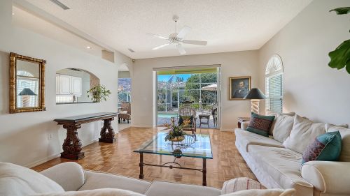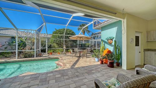 This is a rare opportunity to own a .23-acre corner-lot home in the gated community of Marbella at Palmer Ranch, ideally near the main gate. The property features a spacious grassy area ideal for pets, along with a private, tucked-away garden beside the pool under a beautiful bottlebrush tree. Enjoy the west-facing, solar-heated pool and paver pool deck offering excellent privacy, complemented by an exterior half pool bath, ideal for enjoying Florida's outdoor lifestyle. The barrel tile roof and solar pool heating panels were replaced in November 2024, providing peace of mind. Additional features include hurricane panel protection, non-flood zone status and Evacuation Zone D. The home is move-in ready and offered optionally furnished for the new owner's convenience. Inside, you'll find two bedrooms plus a den, a kitchen with a breakfast area overlooking the pool, a spacious pantry, granite countertops and ample storage, ideal for everyday living and entertaining. Conveniently at the northwest corner of Palmer Ranch, with easy access to Gulf Gate, the library and Siesta Key. Low maintenance fees of $750 semi-annually are modest for this lifestyle. Rentals are not permitted.